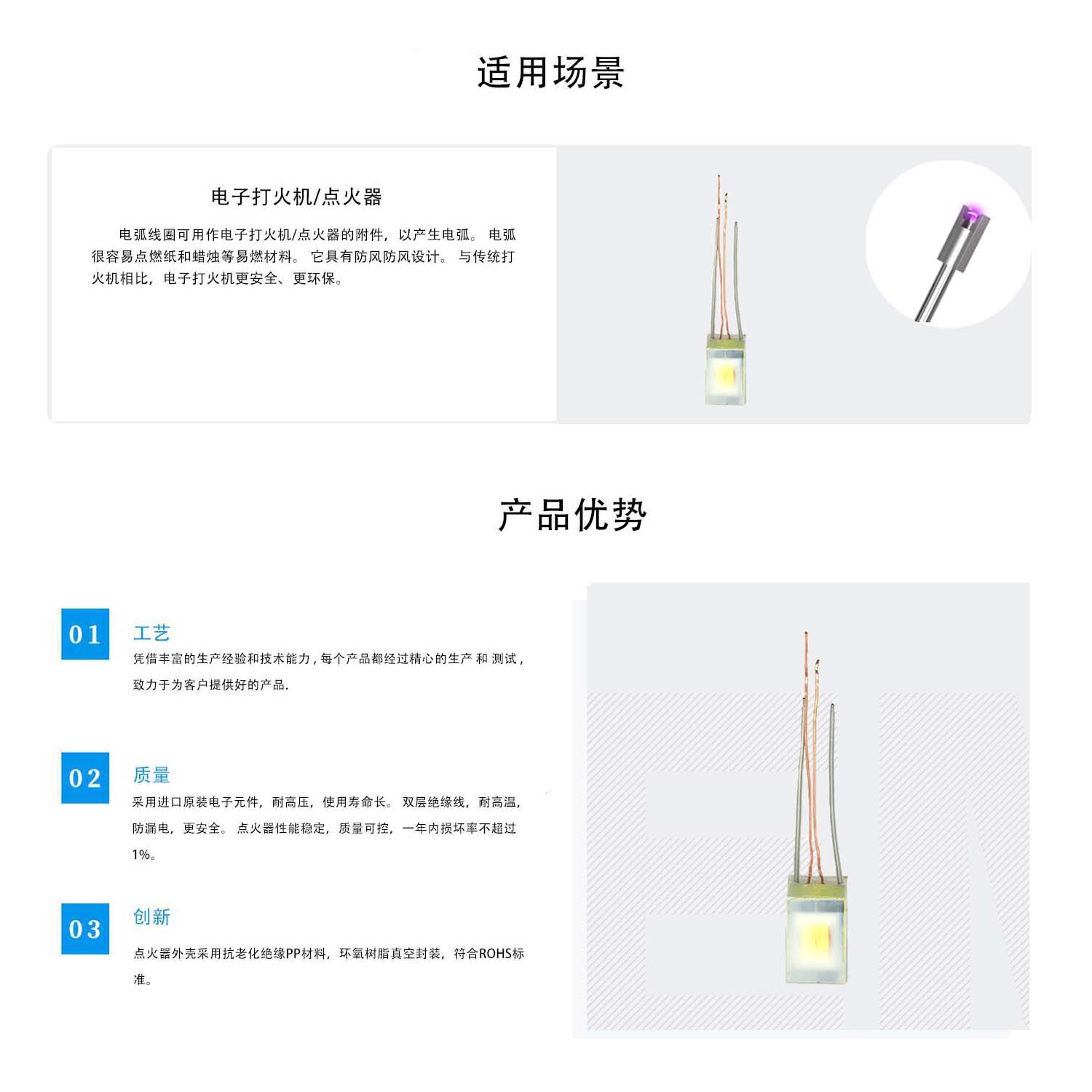 輸入電壓:3.7V 輸出電壓:7.3-7.5KVDC 工作頻率:18-20KHZ 電弧距離:4.5-5mm 輸入線長:40mm 輸入線徑:Φ0.55±0.05mm 銅絲線 輸出線長:40mm 輸出線徑:Φ1±0.05mm 透明鐵氟龍線 尺寸:10.5×8.9×17.8mm 重量:5.4g *以上參數(shù)為人工/儀器測量,會有10%的誤差